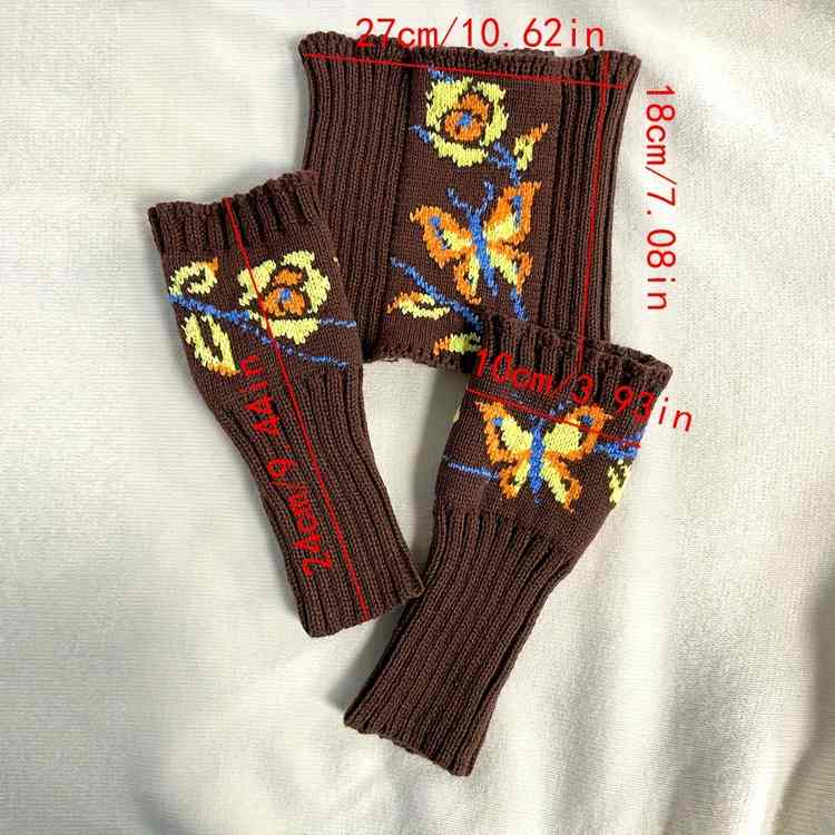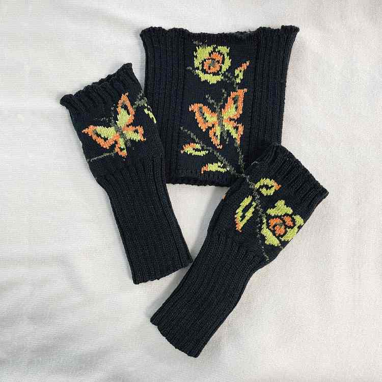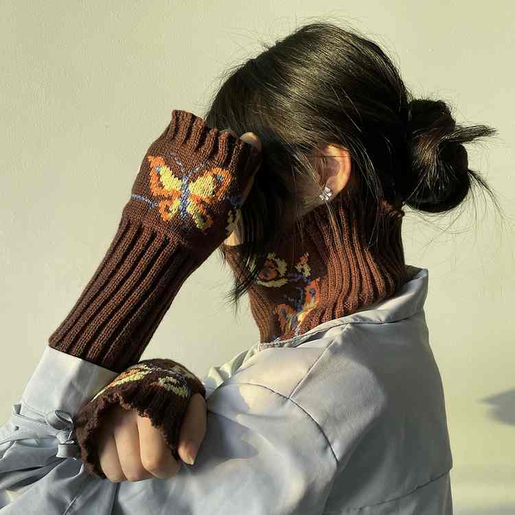 秋冬保暖防寒女士蝴蝶提花手套和围脖套装针织半指手套针织围脖