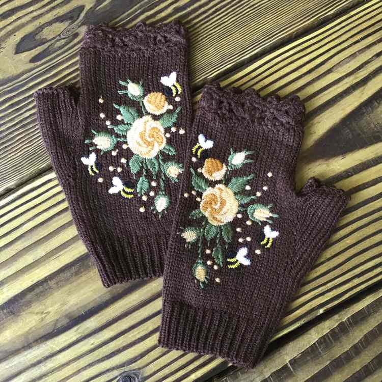 2024 Hot Selling Autumn Winter Women's Trend Warm Half Finger Gloves Flower Pattern Embroidered Gloves