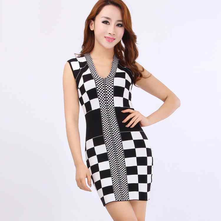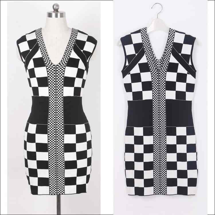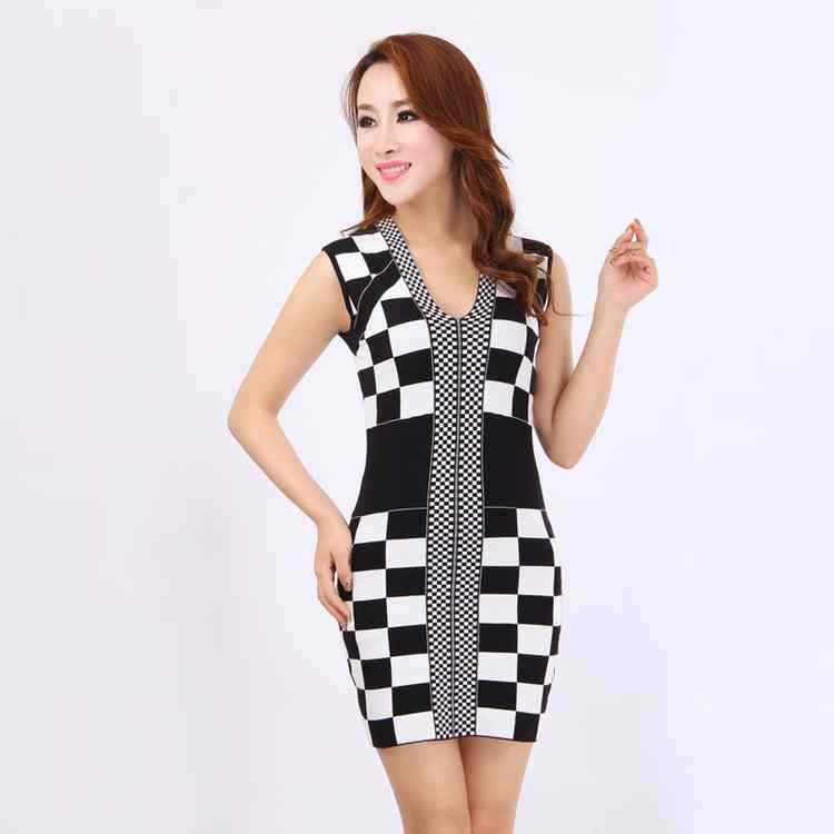 Spring Clothes New Women's Clothes Ol Black and White Checkerboard Lattice Slim Fit Bag Hip Knit Bottomed Sweater Dress