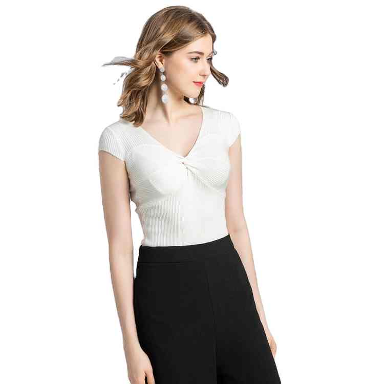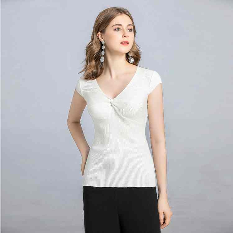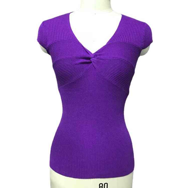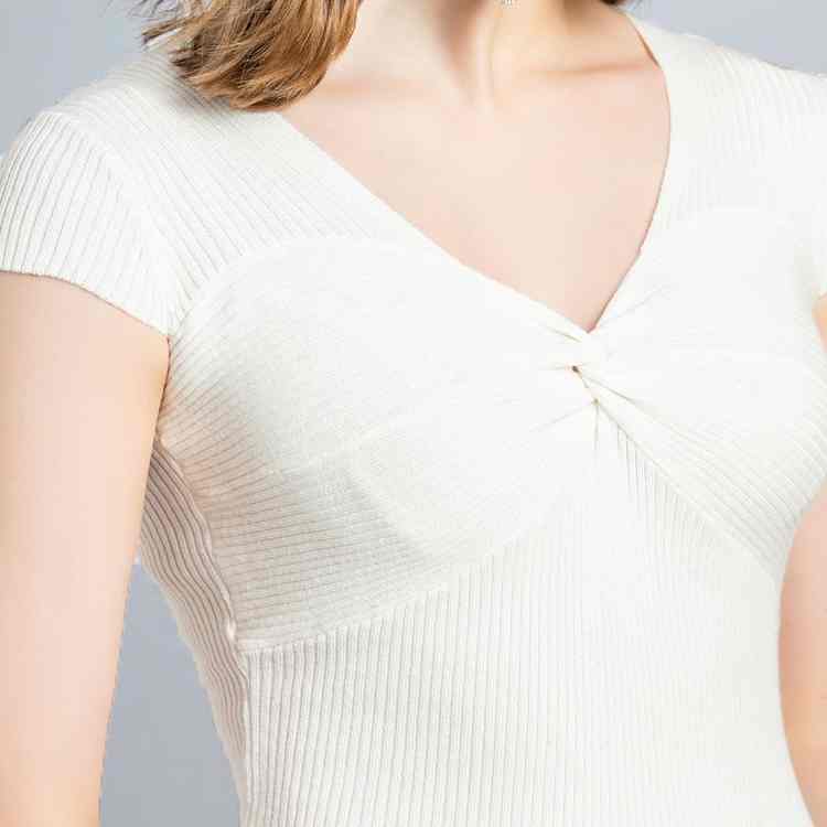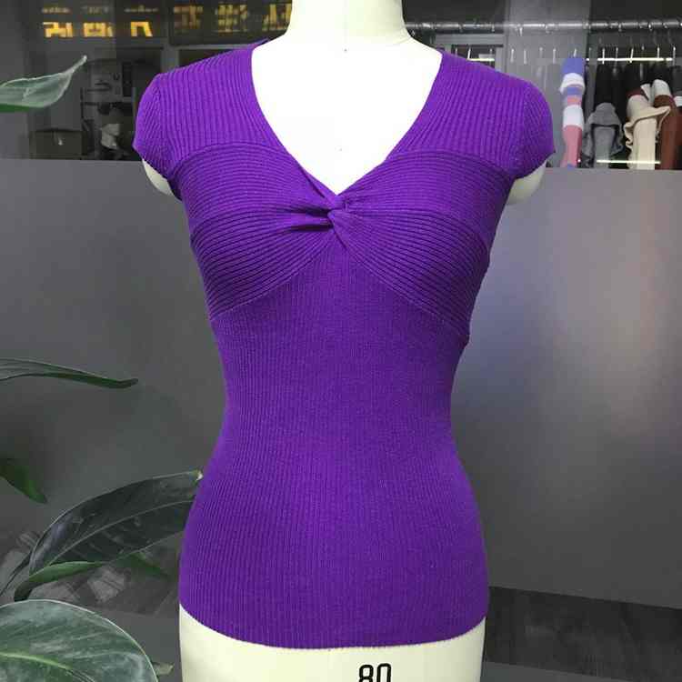 Cross border popular summer women's wear short sleeved V-neck Pullover solid color small shirt slim and thin sweater women